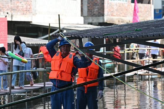 10月18日,大甲街内涝积水仍有约七八十米长,深处达2米多,给供电施工带来极大挑战。“现场积水深、作业环境复杂,我们得想办法把线架到高处安全的地方。”现场负责人、南方电网广西新电力集团靖西供电公司中级作业员赵电介绍,通过现场勘察,抢修人员制定了临时供电方案。