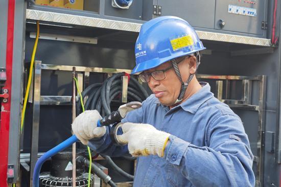 供电人员为抽排涝装备接入临时电源。王亚玲摄
