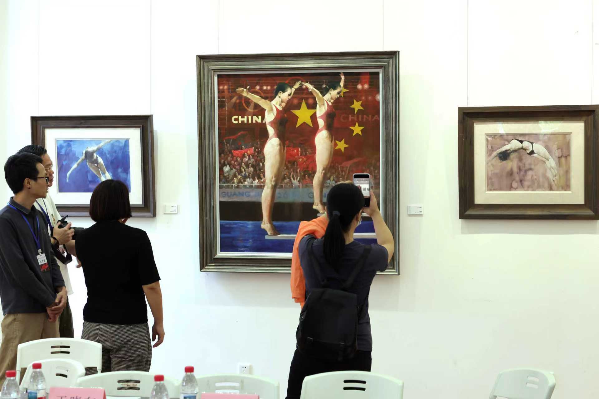 本次展览汇集了汪晓曙、叶献民、卢小根、朱颂民、丘仕坤、李远东、俞畅、谢远清、潘鹤、潘放等众多艺术名家的精品力作。展品形式多样,涵盖中国画、油画、书法、雕塑等。特别呈现多件聚焦体育主题的力作:已故雕塑大师潘鹤的经典作品《容志行》,以厚重形体塑造了广东足球名宿的坚毅风采;画家汪晓曙的油画《NO.4》,则精准捕捉了跳水运动员入水刹那的紧张与静谧。尤为引人注目的是由刘思东、孙戈等八位画家联袂创作的巨幅国画《激情十五运 活力大湾区》,画面融汇足球、跳水、田径等十多项运动场景,并与木棉花、广州塔等湾区元素交相辉映,气势恢宏。作品中,既有对运动员拼搏瞬间的深情刻画,也有对大湾区城市风貌的宏大描绘,力与美交织,传统与现代共鸣,为观众带来一场视觉与心灵的盛宴。
